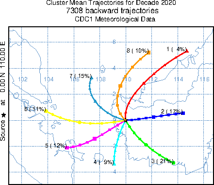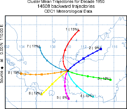The trajectory graphic for each decade shows the mean trajectory for each cluster. Because the clustering process averages trajectories together that have the least spatial variance compared to all other trajectory pairs examined, slight differences in flow patterns may cause the cluster mean trajectories identified by the same cluster ID number to have different upwind origins each decade. Below each graphic is a link to the HYSPLIT formatted trajectory endpoints file used to generate the graphic.