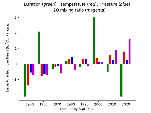 The topmost graphic next to the data entry for the trajectory origin point summarizes the decadal trends as a departure from the 75 year mean for the cluster persistence, origin temperature, pressure, and moisture.