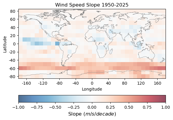 One example of how one might interpret the cluster climatology results can be illustrated by the global map of the change in cluster durations shown as the regression slopes of the average cluster duration by decade at each location. Values represent the average change in the persistence over all clusters. The persistence is defined as the average number of hours that sequential trajectories will stay in the same cluster. Locations with the warmest colors show a positive trend of increasing duration over the last 75 years. Although there is no obvious global trend in the cluster durations, the largest changes in duration, both positive and negative, some adjacent to each other, are centered over the tropical regions, especially in the eastern Pacific at 0N between 150W and 140W. An examination of the decadal trends at those locations shows very large variabilities in duration between decades and some of the longest durations of any location are associated with a single dominant cluster. ![]() Another global view would be the change in temperature at the trajectory origin point. The overall global trend is positive with some of the largest changes in the southern hemisphere. Because the trajectories all originated at 1500 m AGL, temperature changes are expected to be more damped compared to those at the surface. The largest positive change occurs at 30S 90E off the coast of western Australia. A slight cooling is notable near 70S 120E along the Antarctica coastline. A closer look at the decadal trend at that location suggests the trend is within the range of decadal variability and not significant. ![]() This graphic shows the change in the atmospheric pressure at the trajectory origin point. Changes to atmospheric pressure at 1500 m AGL represents changes in the mass of the atmosphere above that level. Therefore, a decrease in pressure means there is more mass below 1500 m presumably due to an increase in density and a corresponding decrease in temperature. Therefore, this may be a more reliable indicator of climate change as it represents a layer average. The graphic indicates the globe is dominated by increasing pressure and therefore temperature. However, there is a large region of decreasing pressure across the Southern Ocean and along the Antarctica coastline. For instance, the location 70S 120W shows a pressure decrease of 12 hPa over the 75 year period. The cooling trend was not so obvious in the previous temperature trend graphic. ![]() The graphic shows the change in the atmospheric moisture at the trajectory origin point. Moisture is shown as the water vapor mixing ratio which is the weight of water to dry air (g/Kg). Moisture can be highly variable and the measurements included in the meteorological data during earlier decades may be unreliable. Nevertheless, the results for all seven decades are presented here for completeness. For instance, the location 0N 110E shows a moisture increase of about 2 g/Kg over the 75 year period. ![]() This last graphic shows the change in the wind speed at the trajectory origin point. Two regions seem more significant than the others. There is a large region of increasing wind speed across the Southern Ocean and along the Antarctica coastline on the order of 0.5 m/s per decade. The other area is along the tropical eastern Pacific where there is a decrease on the order of 0.5 m/s per decade. These decreasing winds might be interpreted to have some effect on the frequency of ENSO events. ![]() The previous graphics showing average trends could have been generated without
